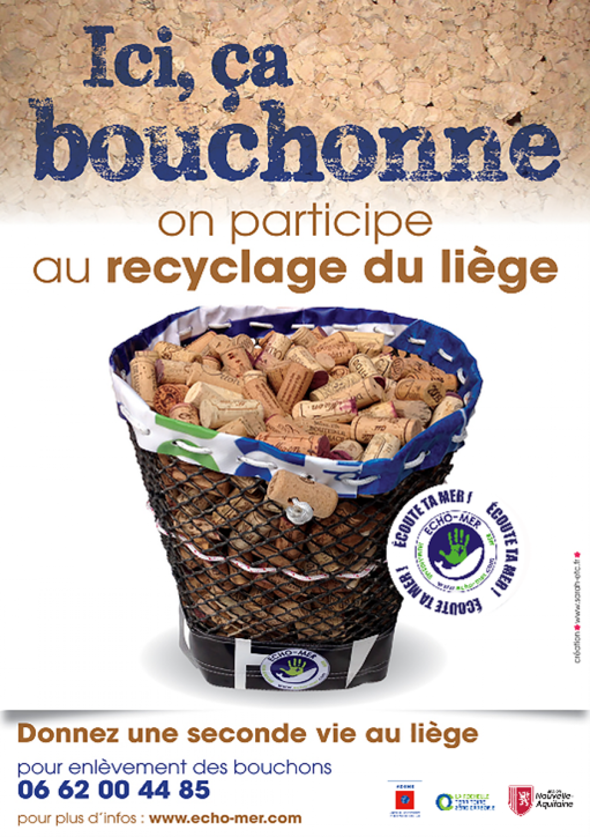 Parallèlement, l’Entreprise Solibio, fabricant de produits cosmétiques et ménagers naturels (Solignac 87), utilise ce granulat de liège pour confectionner des cartouches anti-odeurs à installer sur les sorties de fosses septiques. De plus, Écho-Mer se sert du liège broyé pour garnir les poufs et coussins en voile recyclée proposés à la vente au local associatif et sur la boutique en ligne.